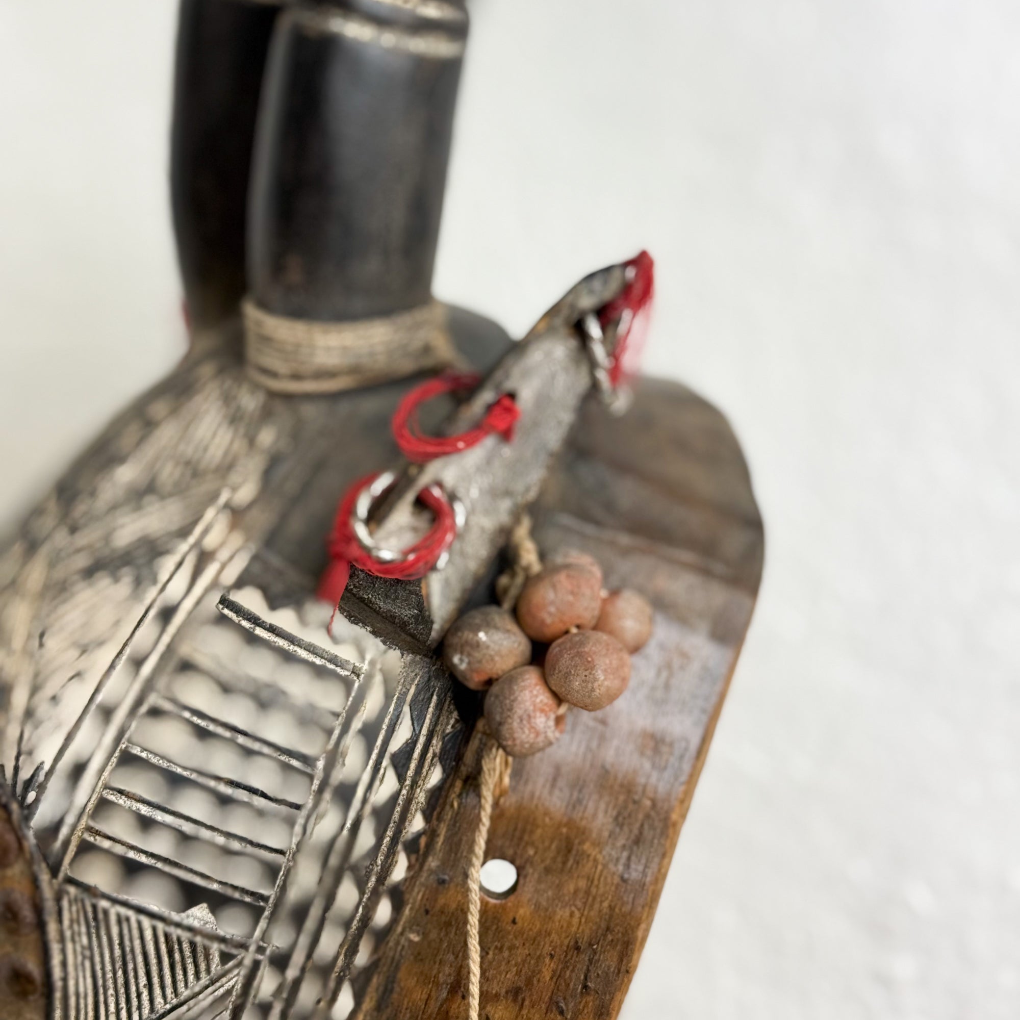 This Marka antelope mask has a soft, silvery-brown patina with dark, looping horns and a front panel studded with warm metal tacks. Small red textile accents and side charms give it a slightly more ceremonial, talismanic feel. Displayed on its stand, it’s perfect on a console or bookshelf, layered with books or as a striking standalone piece.