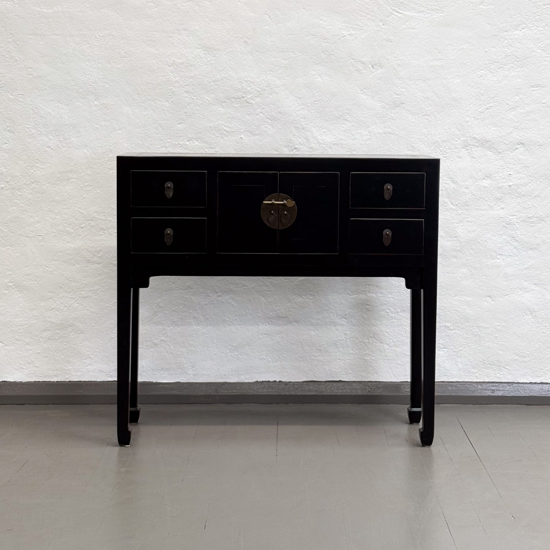 This black Kang style console table features a practical combination of drawers and cupboard doors, offering both storage and display potential. Its compact footprint and symmetrical layout make it ideal as a console, narrow hallway piece, or entry cabinet. With traditional brass hardware, it carries the quiet charm of northern Chinese furniture, making it a grounded and stylish addition to modern and traditional homes alike.Â