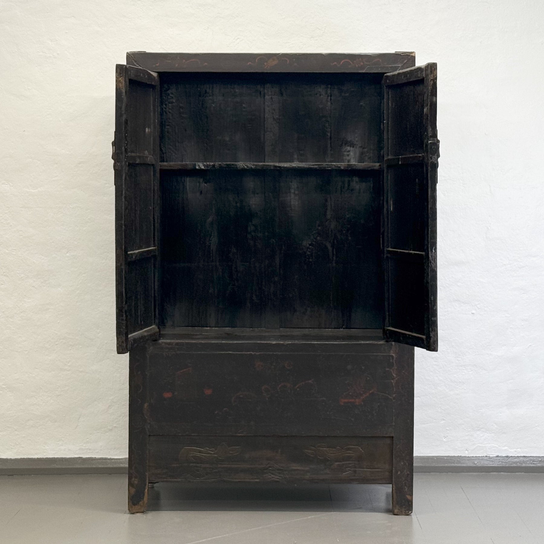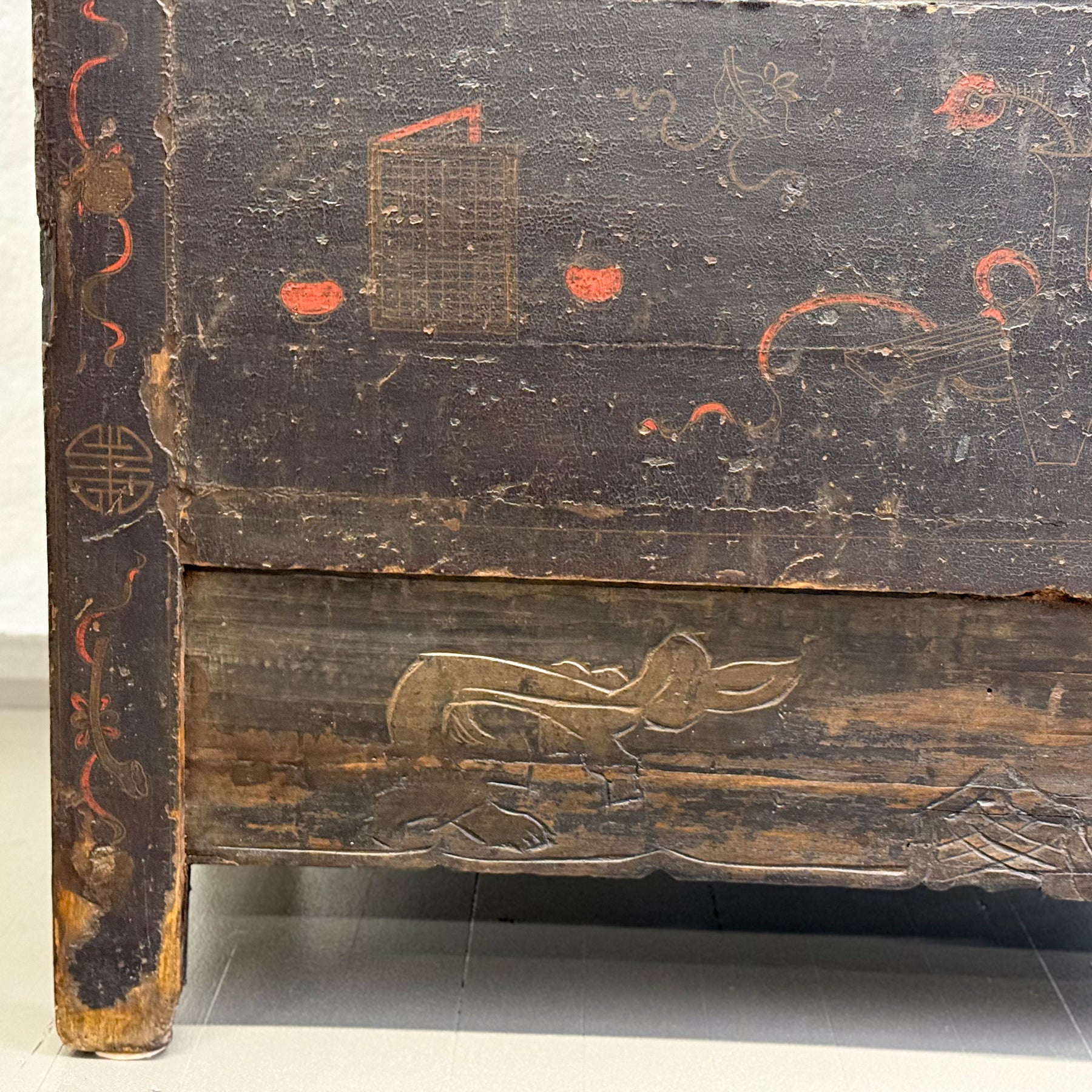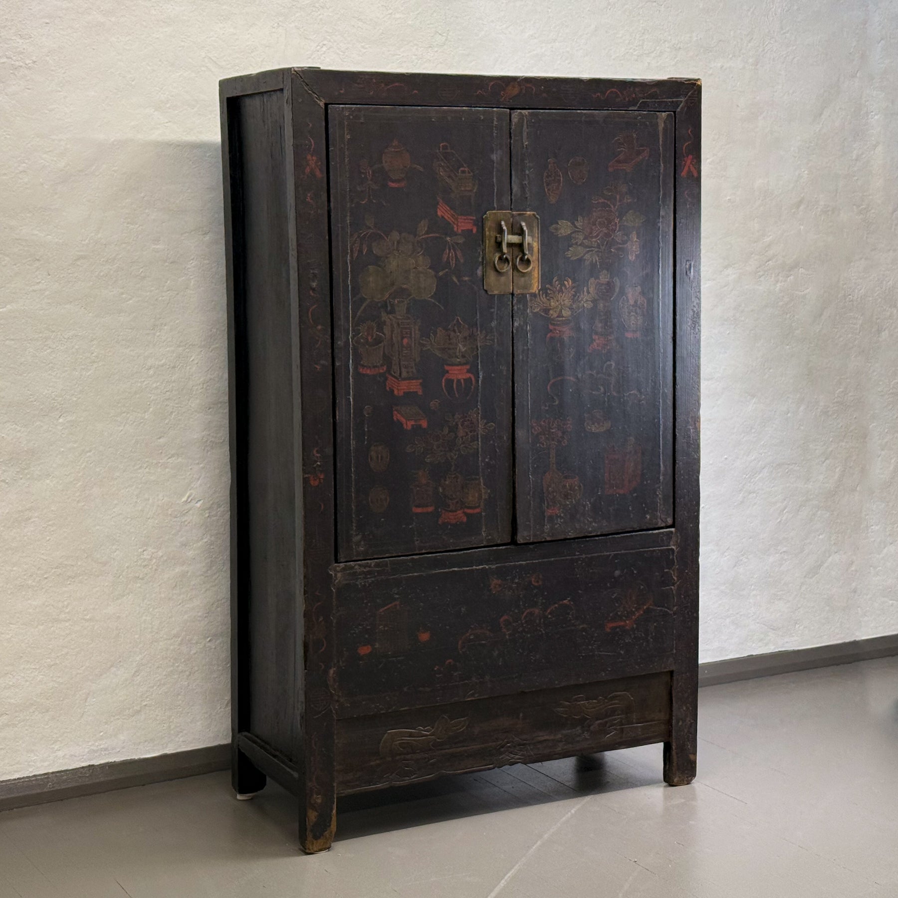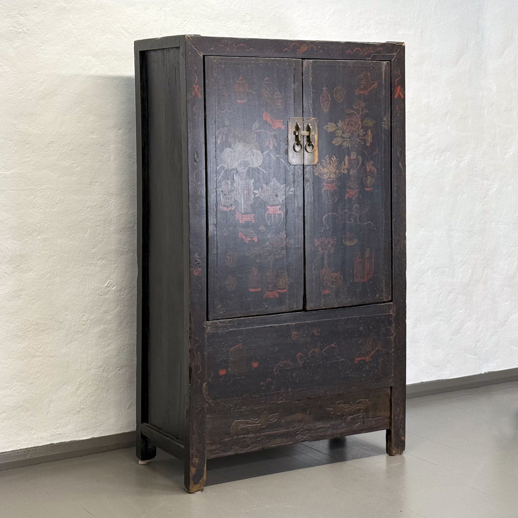 This is an exceptionally beautiful example of these painted cupboards . The artwork has faded to a rich patina giving it an air of mystery. It is without a doubt a work of art but also has the advantage of providing storage for a wine collection or crockery or linen. It is a collectors piece that is timeless.