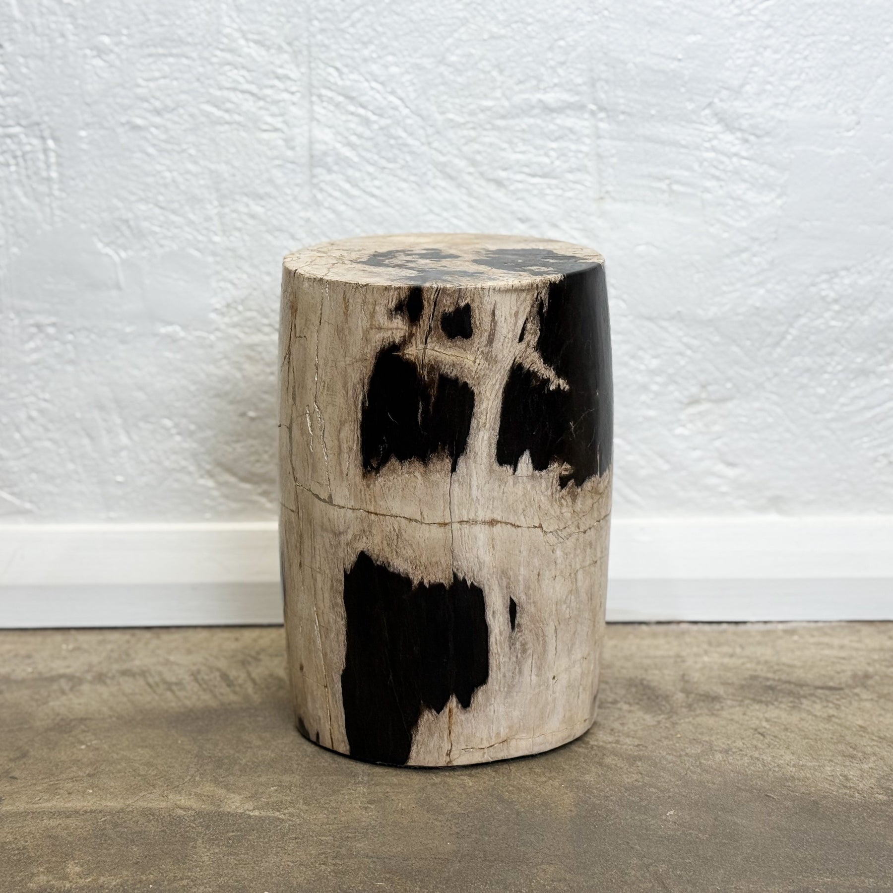 This small petrified wood stool from Indonesia is predominantly beige with soft black-brown marbling that reveals its ancient origins. Compact yet weighty, it’s ideal as a low side table, decorative plinth, or sculptural accent. Each hand-finished piece celebrates the natural artistry of fossilised wood — a perfect harmony of function, form, and geological beauty.