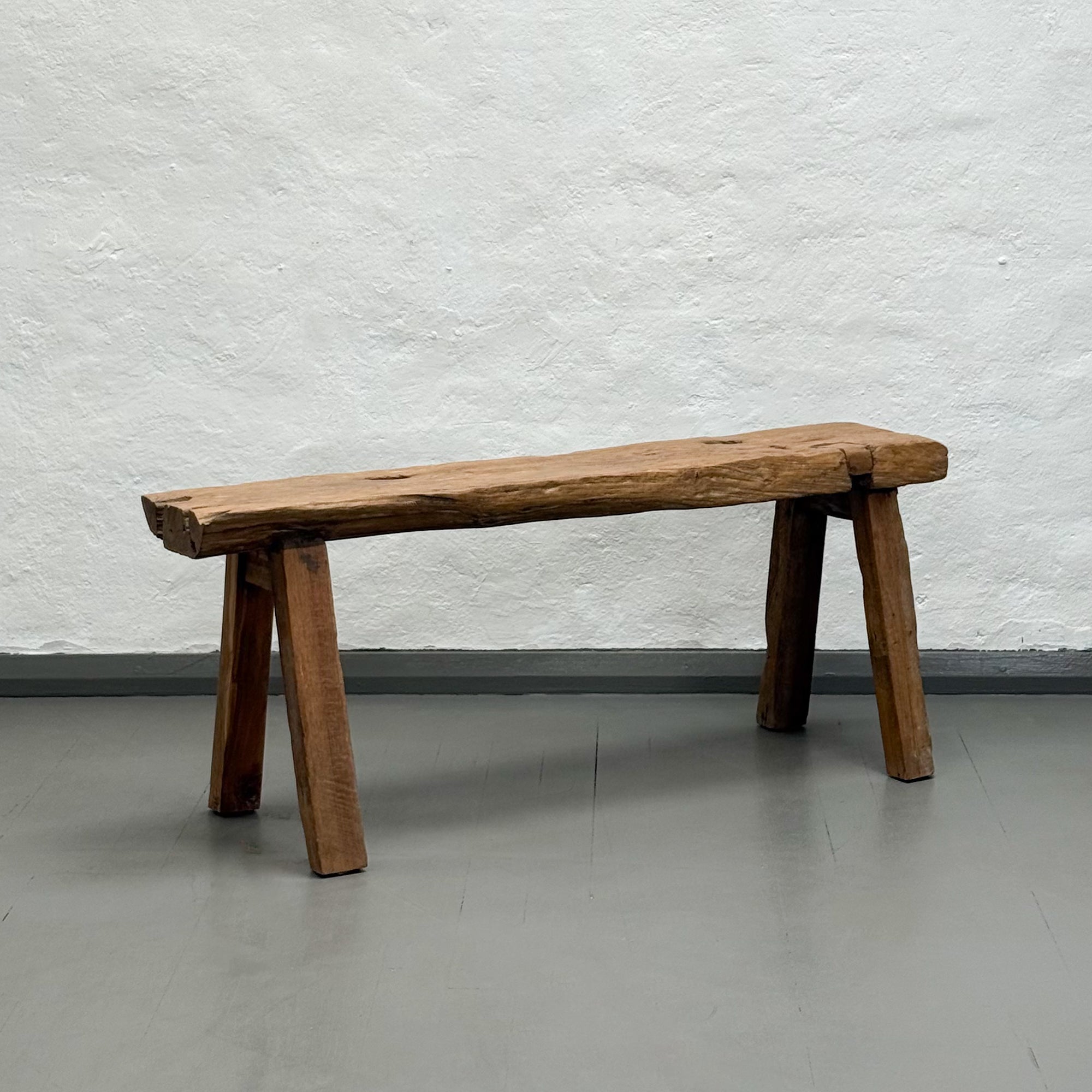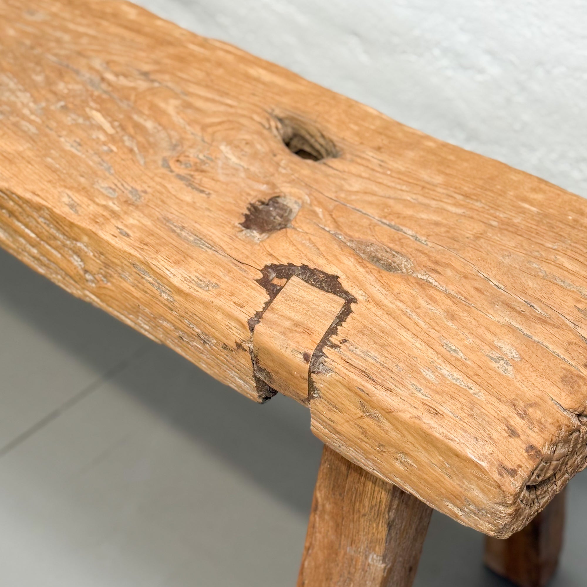 Compact and full of character, this rustic Balinese bench is crafted from solid natural teak with a thick top and beautifully gnarled, knotted grain. Its simple, primitive form and aged patina give it a grounded, organic presence. Ideal as a side bench in a hallway or at the end of a bed, it brings a raw, earthy charm to both contemporary and country-style interiors.