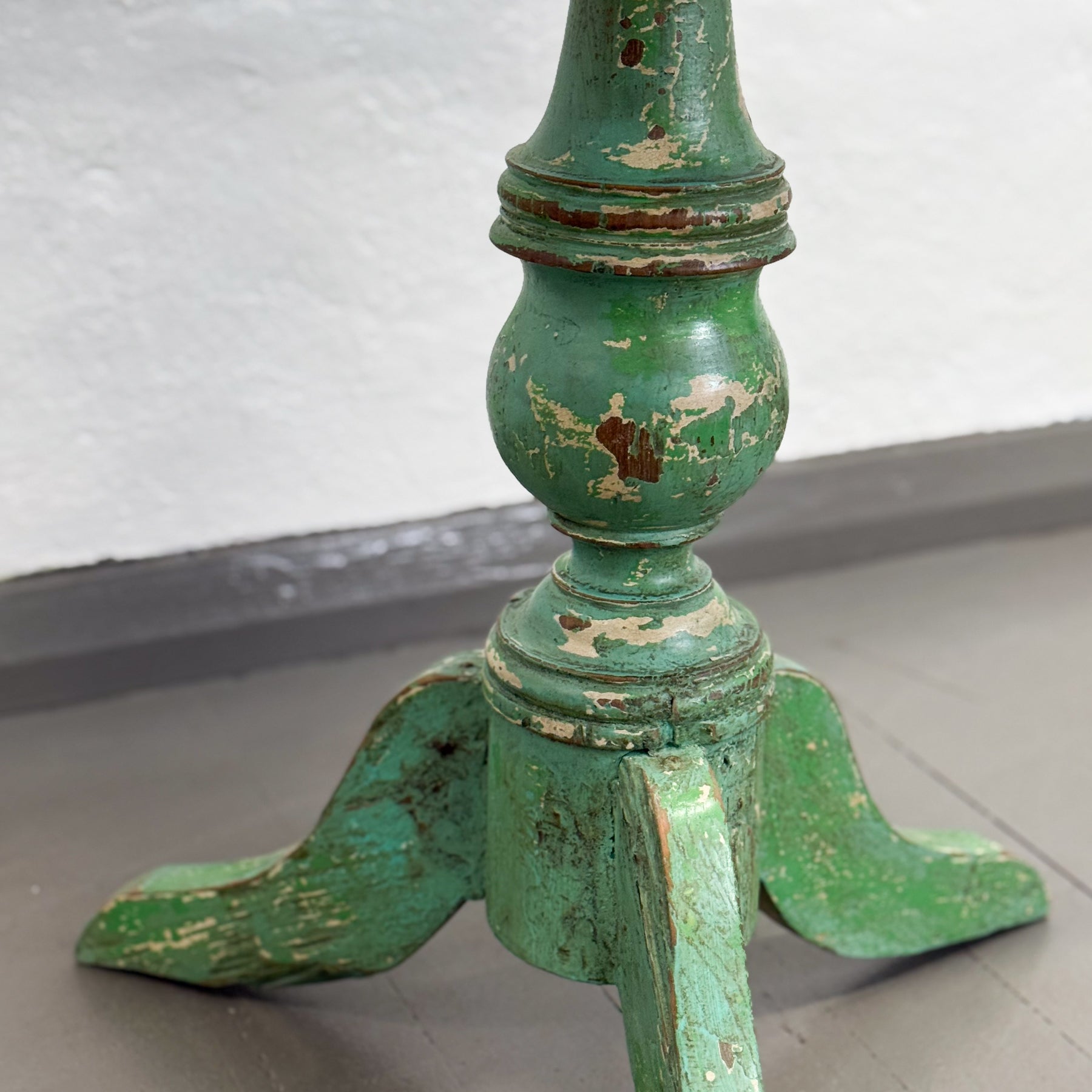 This charming pedestal side table, exquisitely hand made in Bali, features a distressed green finish and graceful turned base. Its understated proportions and vintage character make it perfect as an accent piece, adding a refined layer of color and artisanal texture to sophisticated living spaces or curated interiors.
