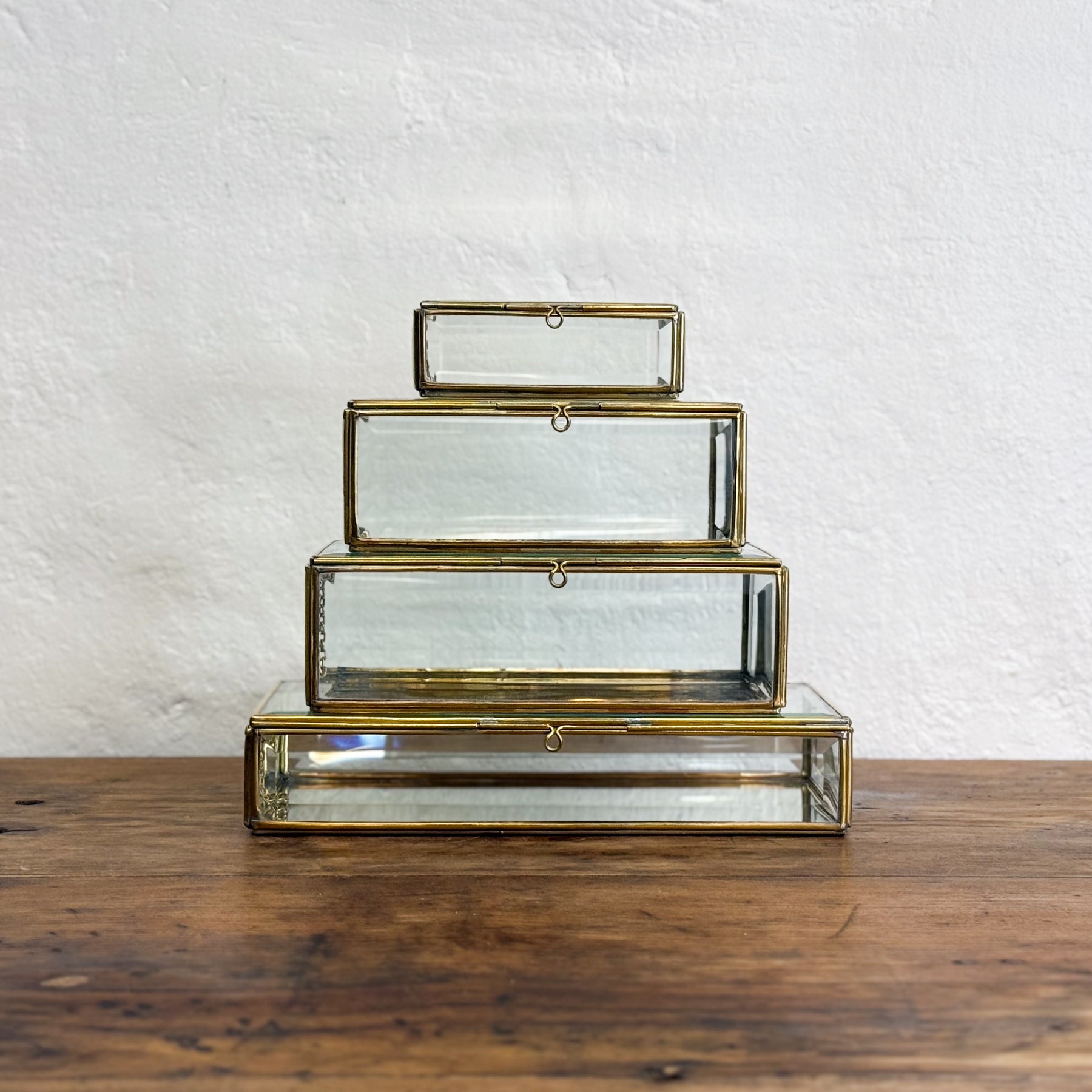 This elegant gold-finished glass display box from Bali is perfect for storing and showcasing cherished items. With bevelled edges and timeless appeal, it blends luxury and practicality. A beautiful accent for dressing tables or sideboards, it highlights the refined craftsmanship of Indonesian artisans. Available in four sizes or layer all four as a set.