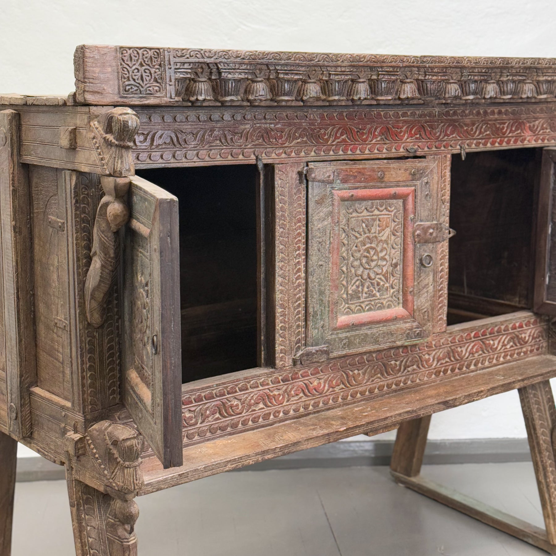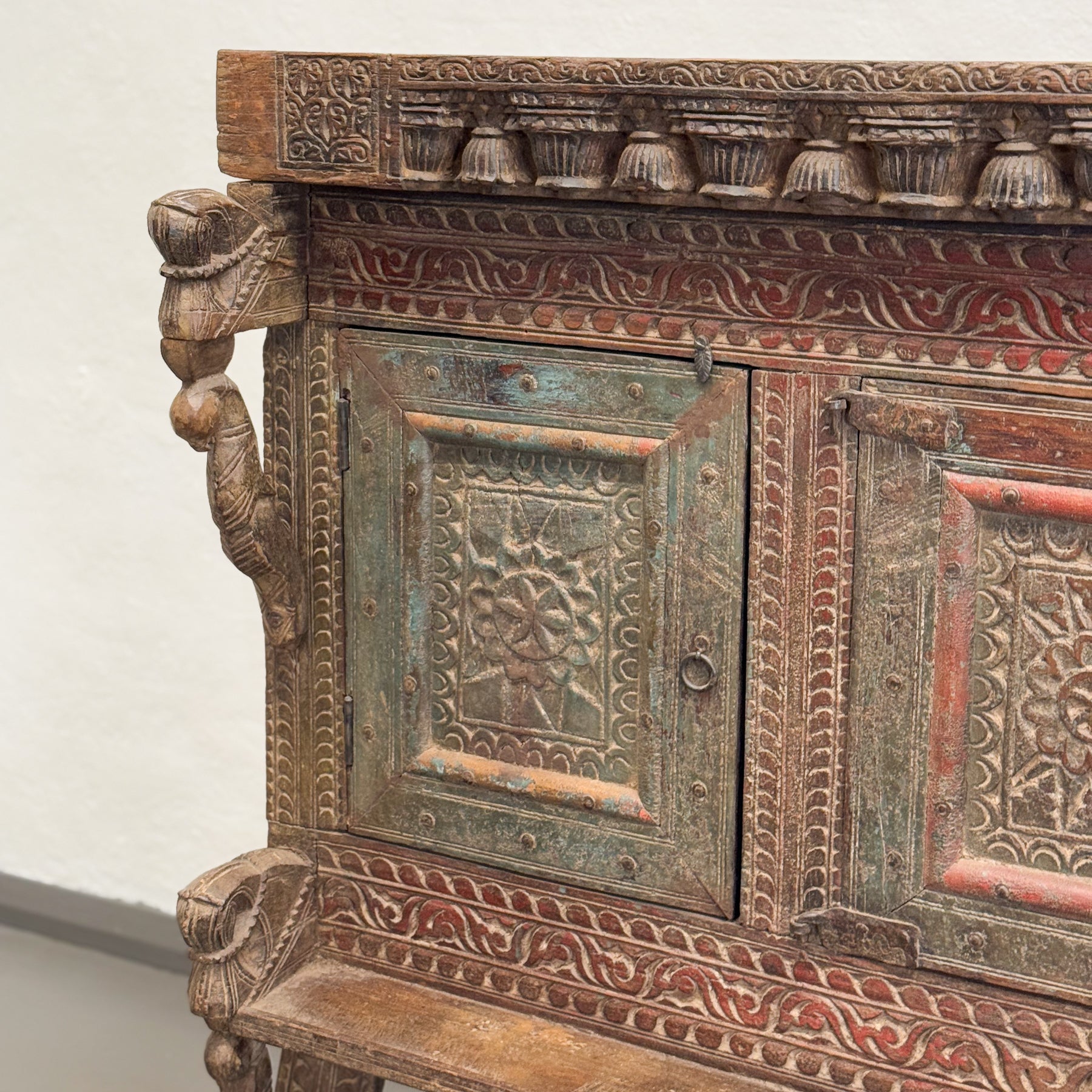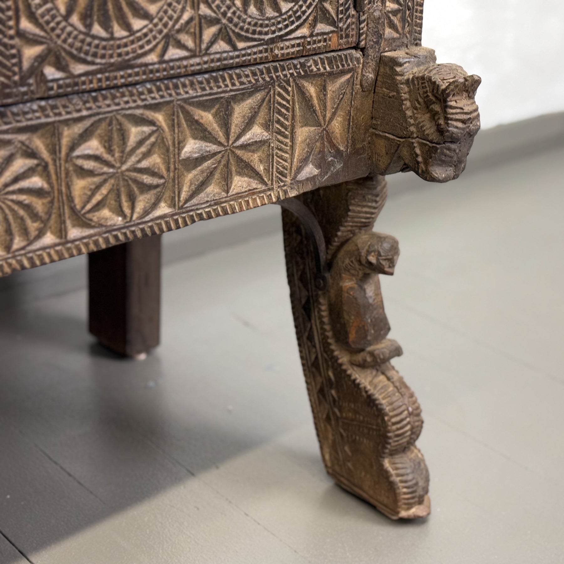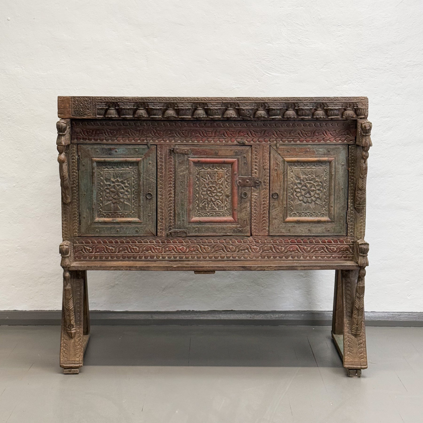The antique carved Majuce chest is a rare and stunning example of traditional Indian woodcarving. These chests, originating from Rajasthan and Gujarat, were once used to store family heirlooms, jewelry, and textiles. Featuring elaborate hand-carved details, this piece reflects the centuries-old artistry of Indian furniture makers, making it both a functional storage unit and a breathtaking statement piece. In particular, the beautifully aged painting of this piece make it truly special.