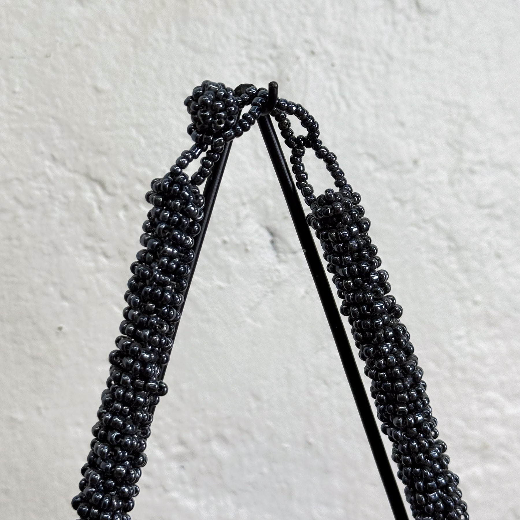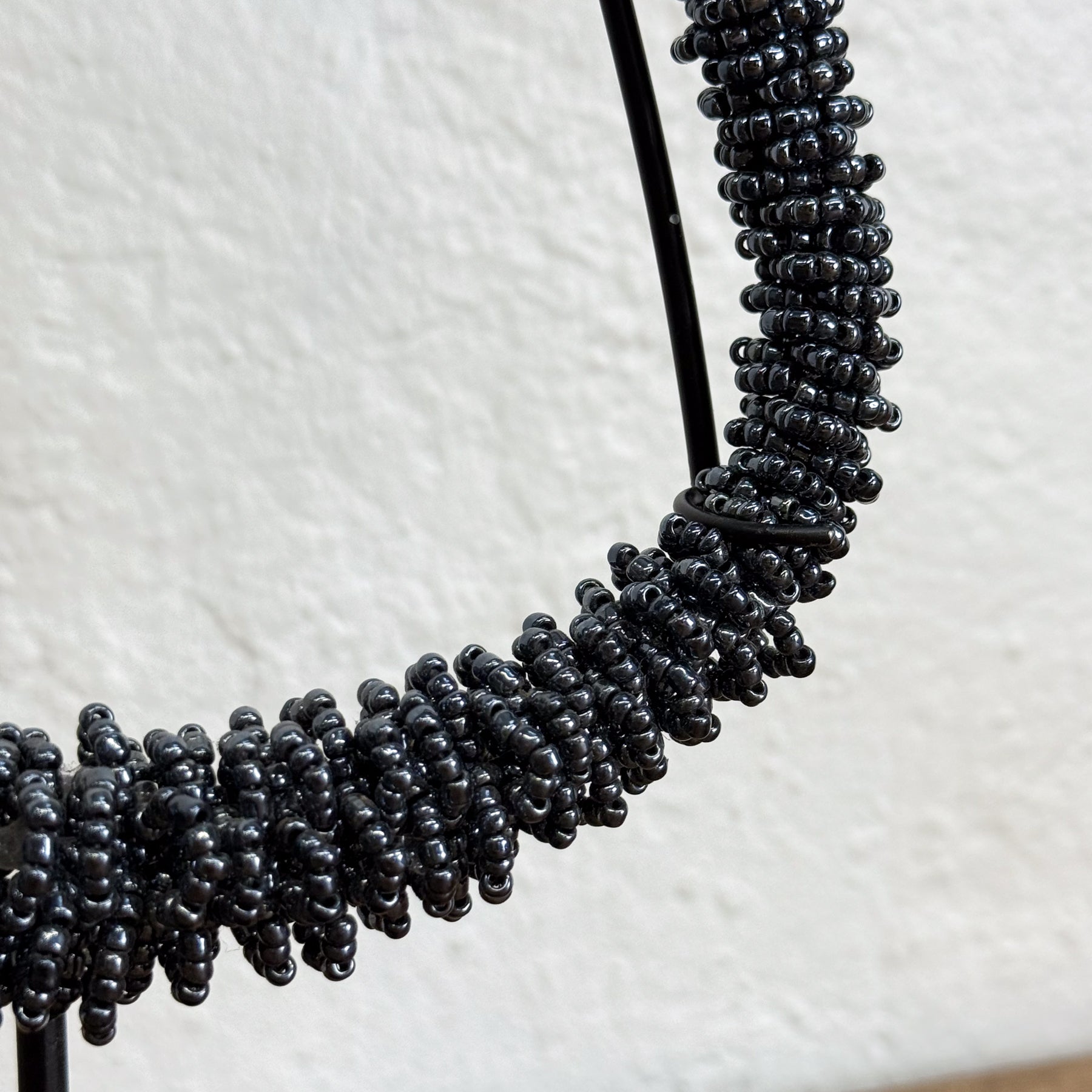 A striking handmade beaded necklace displayed on a simple black stand. Deep blue tones and intricate beadwork catches the light beautifully. Ideal for styling your interior, placing on on a hall table, console, or bookshelf, to add texture and cultural depth to your interior.