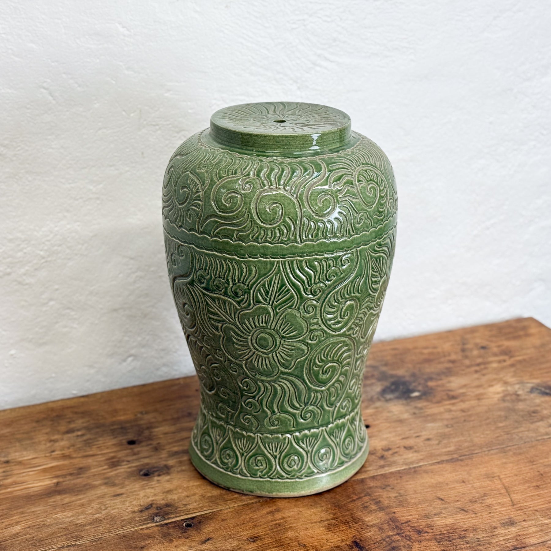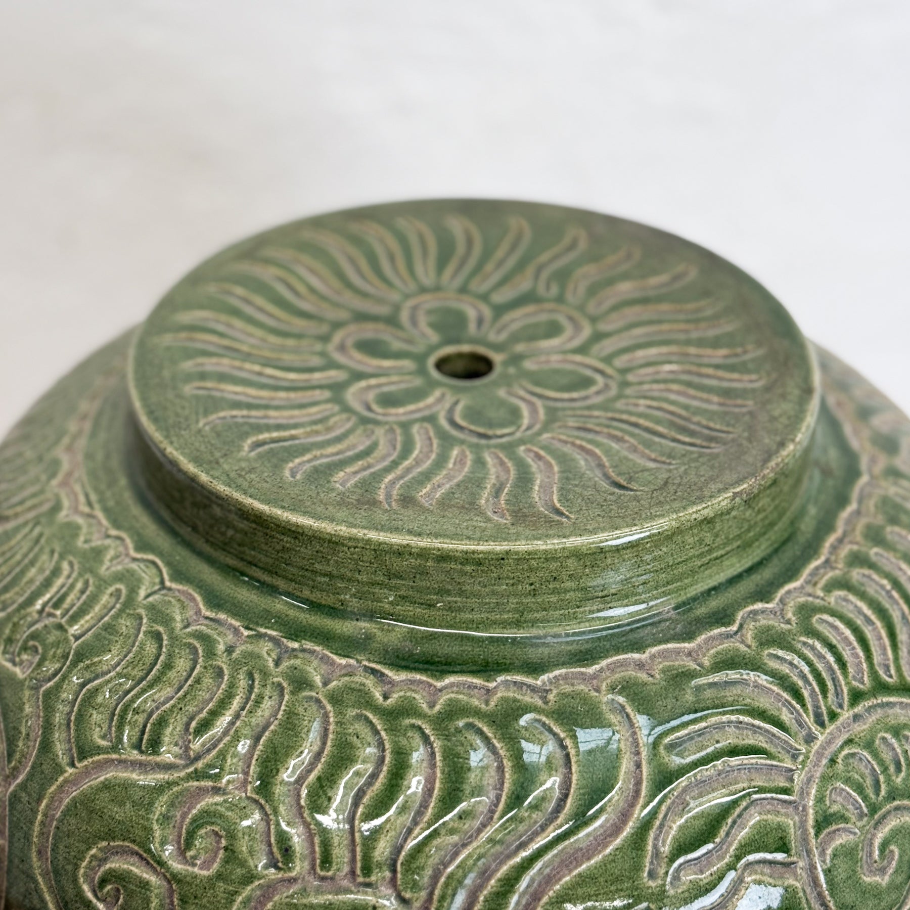 Decorate your interior with an embossed floral ceramic lampbase, crafted in Bali for timeless elegance in a beautiful green glaze with emboss engravings. Ideal for living rooms, bedrooms, or offices, this lamp base pairs intricate flowers and organic texture for a soft, inviting light source—complementing modern, eclectic, or beachside décor schemes. Please enquire about our fully customizable lamp service with fittings and shades available. Any vase in our range can be converted to a lamp.